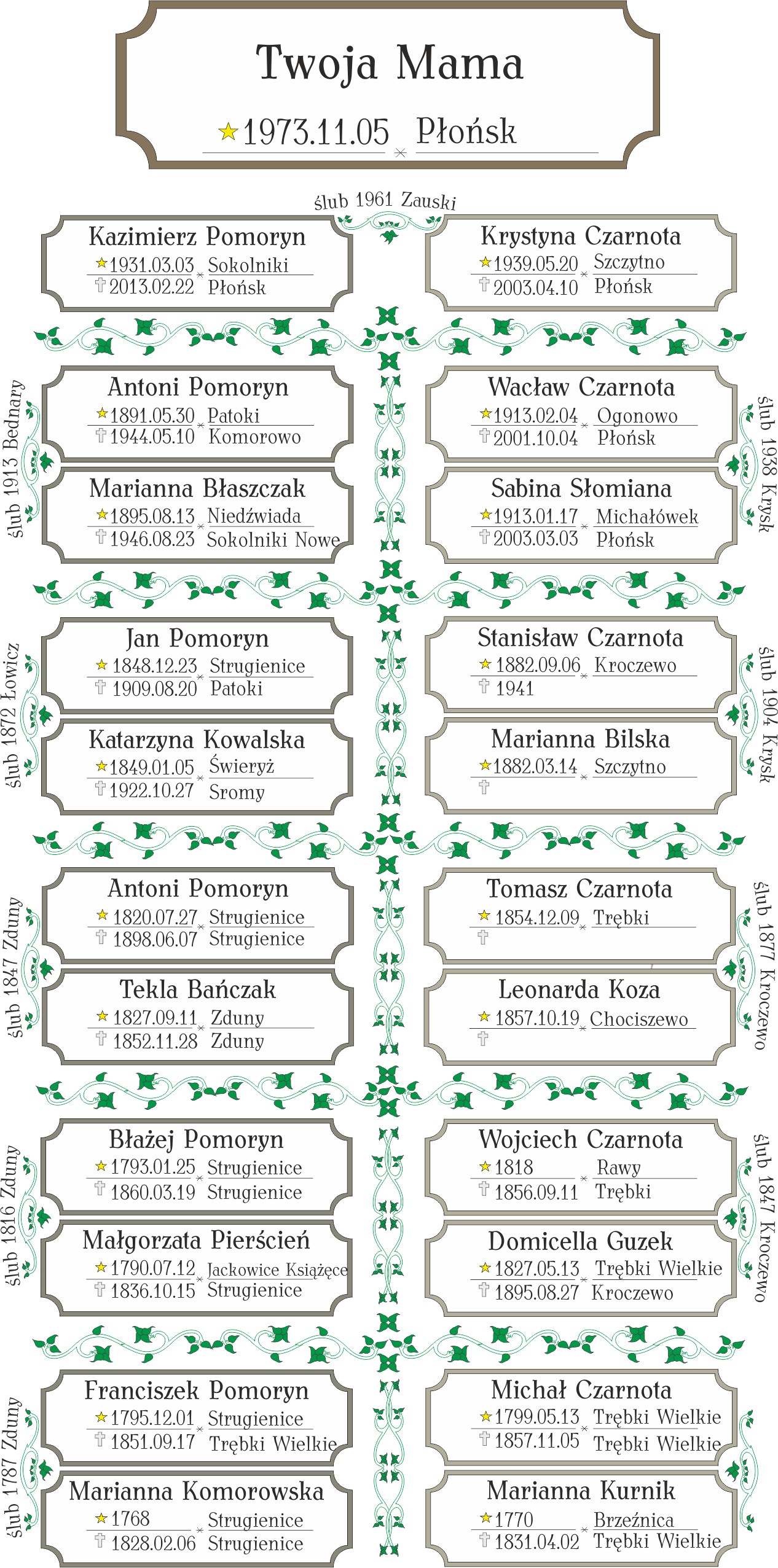 Tak może wyglądać drzewo przodków Twoich rodziców (tutaj przodkowie mamy) po linii męskiej dziadka i babci macierzystej. Zebrane informacje o przodkach pozwolą Ci zdobyć wiedzę o swoich dziadkach, poznasz imiona swoich pradziadków, prapradziadków, poznasz nazwiska swoich babć w każdym pokoleniu co zapewne będzie dla Ciebie dużą niespodzianką. Zobaczysz jak przebiegały migracje obu rodzin, gdzie mieszkali, z jakich powodów się przenosili. Jeżeli będzie to możliwe poznasz ich dokładne miejsce urodzenia wraz z datą dzienną, dowiesz się kiedy i gdzie zmarli, na którym cmentarzu zostali pochowani. Dowiesz się w którym kościele w jakiej miejscowości i kiedy wzięli ślub. Otrzymasz kopie cyfrowe oryginalnych dokumentów, wraz z informacją o miejscu ich przechowywania. Przekonasz się w jakim języku zapisano dokumenty Twoich przodków, dostaniesz tłumaczenia dokumentów na język polski w formie plików pdf gotowych do wydruku w dowolnej ilości. Dowiesz się czym się zajmowali Twoi przodkowie, gdzie mieszkali przez te wszystkie pokolenia, poznasz ich historię która doprowadziła ich do miejsc które Ty znasz.